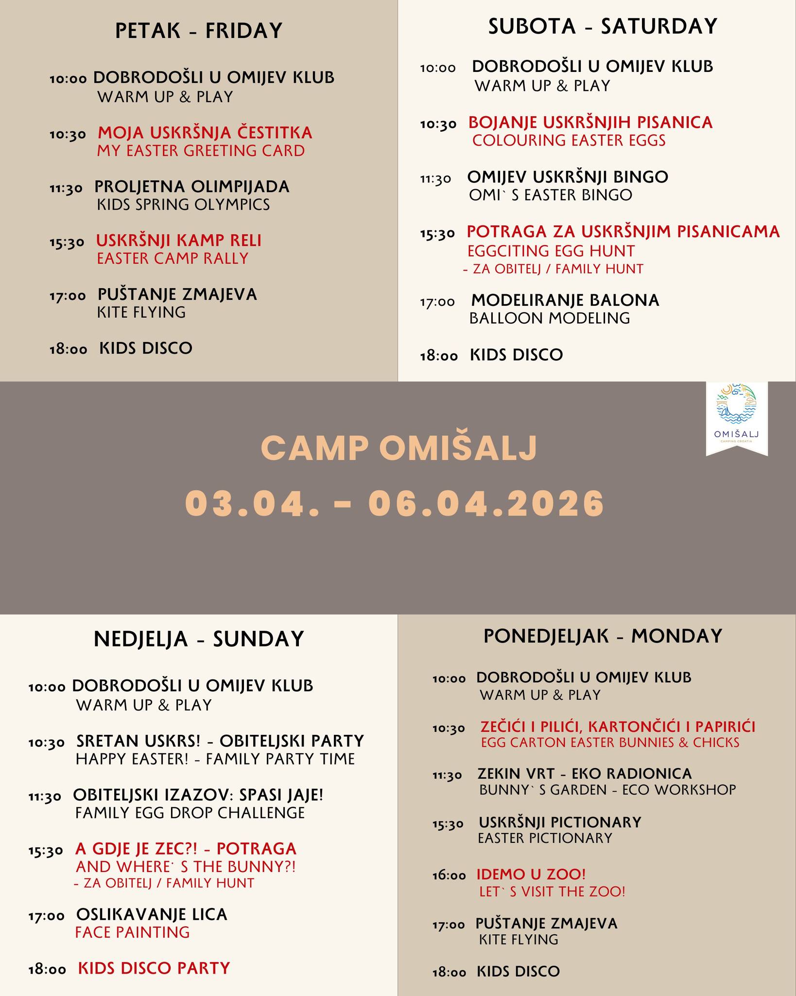 Od 03. travnja do 06. travnja 2026., gostima je na raspolaganju pažljivo osmišljen program za djecu i odrasle. Aktivnosti uključuju tradicionalnu potragu za uskrsnim jajima, kreativne radionice, svakodnevnu animaciju, razne igre te dječji disco svaki dan. Raznovrstan obiteljski program osigurava zabavu za sve uzraste.